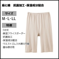 ●商品特性:5分丈・麻混フライスボーダー・抗菌加工・保湿成分配合・ウエストゴム入れ替え可能・重ね穿き用
