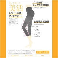 ●商品特性:8分丈・ムーブコントロールグラデーション設計(段階着圧設計)・高着圧設計・ふくらはぎ10hPa・太もも8hPa・カロリー消費アップ機能(美活)・80デニール相当・パンティ部立体設計・デオドラント加工・毛玉になりにくい・マイクロファイバーナイロン使用