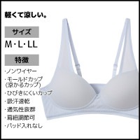 ●商品特性:ノンワイヤー・モールドカップ(涼かるカップ)・ひびきにくいカップ・吸汗速乾・通気性抜群・肩紐調節可・パッド入れなし