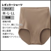 ●商品説明 触れた時にひんやりする、暑い日にぴったりのショーツです。ウエスト・裾にゴムを使用していないので、締め付け感が少なく快適。下着のラインが出にくい足ぐりきりっぱなし仕様。。